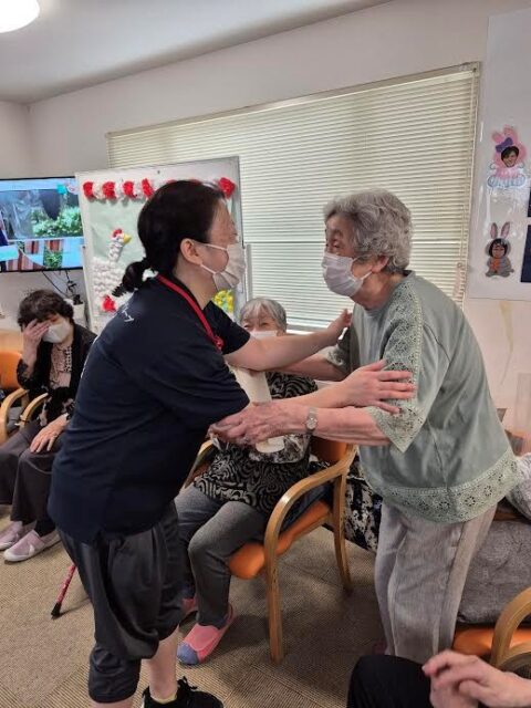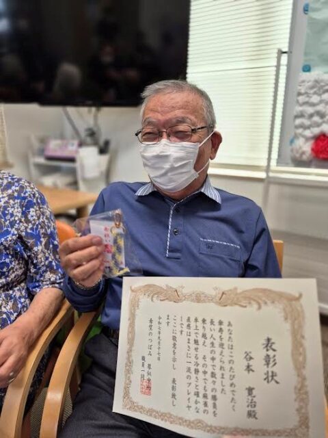 そして、劇の後は、賀寿(喜寿・米寿など)のお祝い。節目を迎えられたご利用者様お一人おひとりに、表彰状と記念品の贈呈いたしました。名前を呼ばれて前にでられた方の中には、表彰状を手にして、思わず涙ぐまれる姿も。その場にいた全員が、温かな気落ちに包まれ、笑いと感動がたっぷり詰まった敬老会となりました。