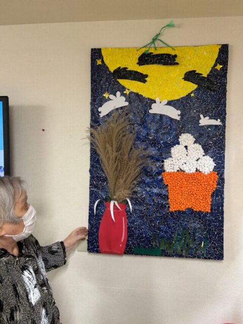 こちらはちぎり絵で制作し、お団子はお花紙を丸め貼り付けています。ススキは本物を飾りつけしてみました。なかなか風情のある仕上がりにご利用者様も感心して眺めていました。