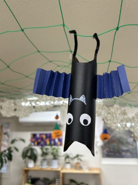 こちらのかわいいコウモリくんはトイレットペーパーの芯を利用しています。ご利用者様が芯に黒の折り紙を丁寧に巻いて貼り付けてくださいました。