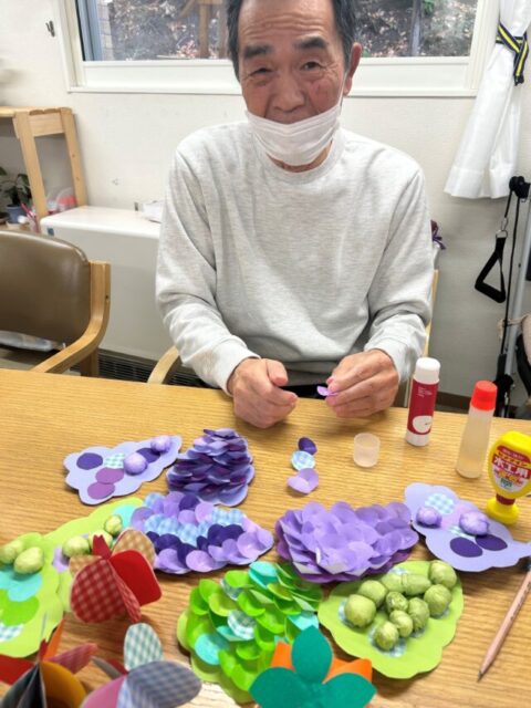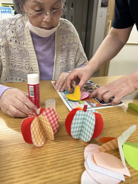 リンゴは折り紙を貼り合わせて立体感あるかわいい感じに仕上がりました。ブドウもお花紙を丸めたりいろいろな折り紙を貼り付けるなどポップな感じに進んでいますよ。ご利用者様からは「かわいいねーこんな色でもリンゴに見えるから不思議」「ブドウが食べたくなるね」など楽しそうな会話も聞こえてきます。
