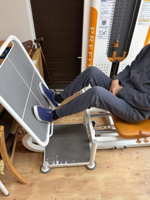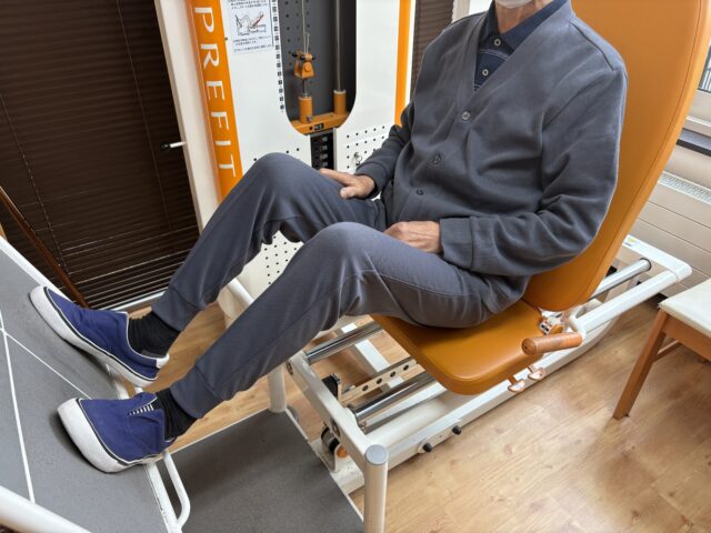 太ももやお尻周辺を鍛えることで、立ち上がりや歩行動作をスムーズに行えるようになります。足を伸ばし切らないように気を付けながら、回数・時間を決めて行っております。両足を使うため力は入りやすいですが、時間とともに負荷の強さも感じ、シンプルながら取り組みがいのある機械です。