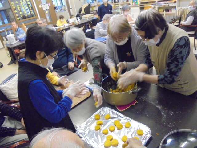 カボチャ団子を皆さんと一緒に作りました!かぼちゃを茹でるところから始まり、片栗粉はもうちょっと入れたほうがいい、など本格的なカボチャ団子が出来上がり皆さんでこねて、丸めて美味しいカボチャ団子を作って頂けました。味もしっかりおいしく、サイドメニューでクラッカーとチーズのおばけも一緒に添えて楽しいハロウィン会を行うことができました!!