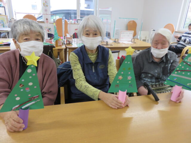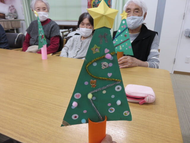 ご利用者様がそれぞれの作品をご覧になって、「あら、このシール私も貼りたいわ」「この星の形大きくて素敵!」とお話しされながらの楽しいクリスマスツリー作りになりました。