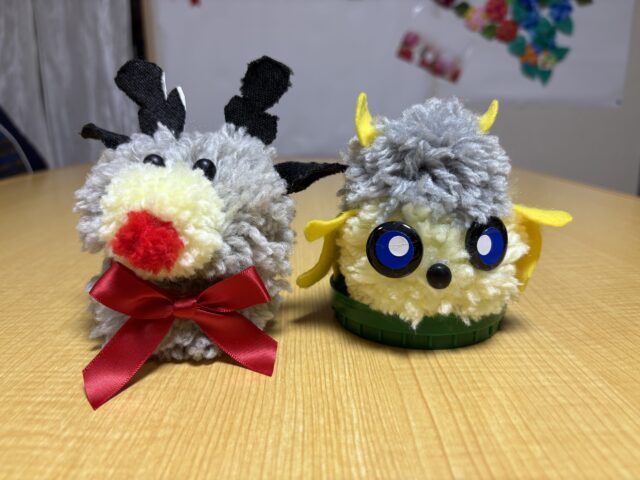 こちらは、毛糸を使って制作した「ミミズク」と「トナカイ」です。