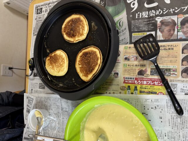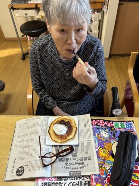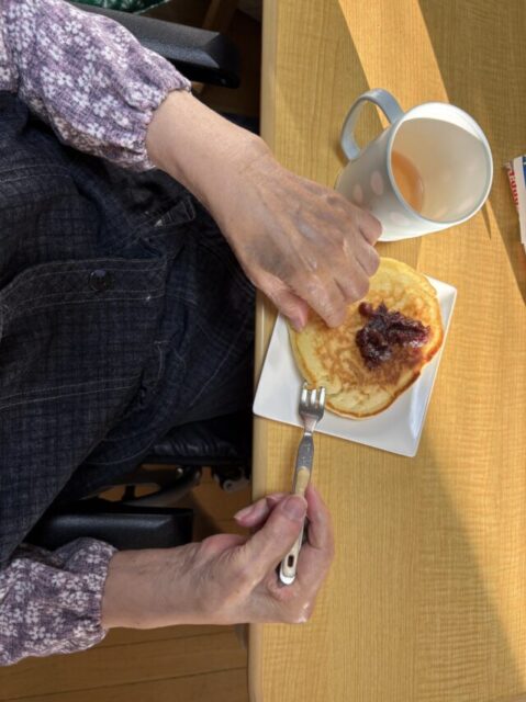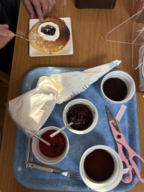 今回東館では「おやつレク」を開催し、ホットケーキ作りを行いました。