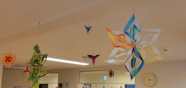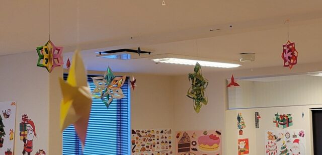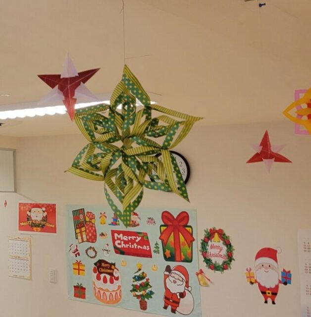 クリスマスも間近にせまっており、色とりどりな壁の掲示物や折り紙で作った飾りつけなどをご入居者様と一緒に作成致しました。とても華やかさになり皆さま喜ばれております。