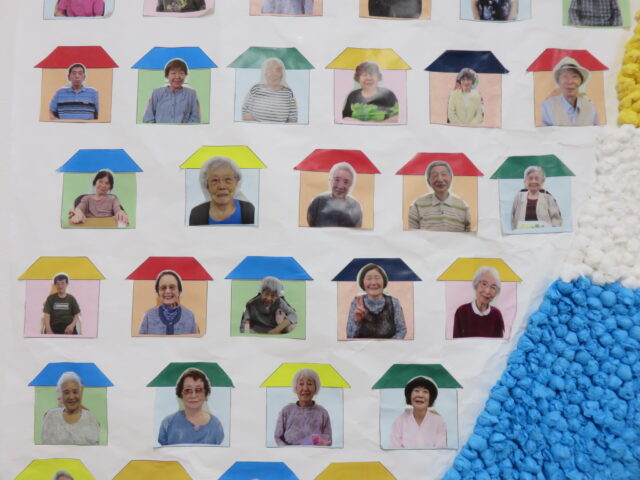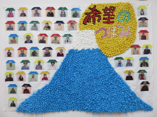 さて、今回の創作はご利用者の皆さんと一緒に貼り絵に取り組みました。お花紙を小さく丸めた物をたくさん作成し、富士山と太陽に見立てました。富士山と太陽が重なる瞬間は「ダイヤモンド富士」と呼ばれ、成功や目標達成を表します。また、ご来光は生命力・希望の意味があり、さらに富士山は「不死」「無事」とも言われています。そんな雑学を話しながら「私近くで見たことあるよ、だからいつまでも元気なのかも」「私も実物見て元気になりたいわ」など、楽しい会話が飛び交いながらとても素敵なダイヤモンド富士の完成です。