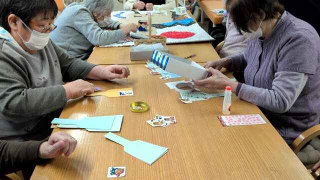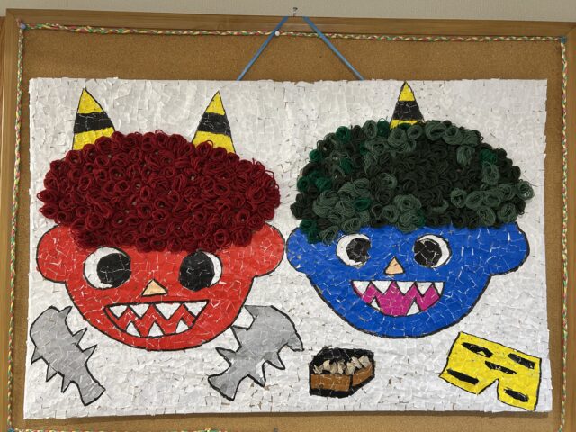 鬼の髪は毛糸をぐるぐる巻きにしたものを貼り付けており、完成品を見たご利用者様は「あー何に使うのかと思ったら!よく考えてるね~」などと驚いておられました。