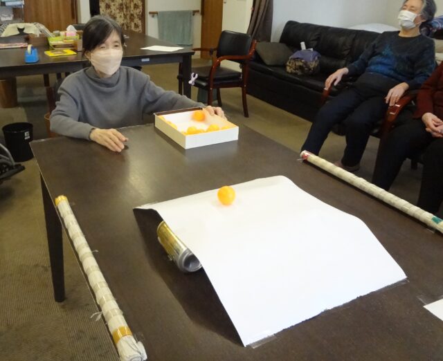 ピンポン玉を転がして紙コップに入れる「ピンポンカップイン」という大変シンプルなゲームを昨年の10月にご紹介させて頂きましたが、この度、改良を重ねてテーブル上に障害物を設置した「障害物ピンポンカップイン」を行いました。これはティッシュ箱やお椀を置き、その上に紙をのせて大小の坂を作り、それを障害物として、その坂の上にピンポン玉を転がせて端のカップに入れるというゲームです。難易度が旧作よりいっきにあがり、坂をこえたとしても加速がついてカップに入らない場面が多くなりました。一方で、大小の坂を通ることによって予測不能に変化したピンポン玉の転がり方でカップインする場面も見られて面白かったです。